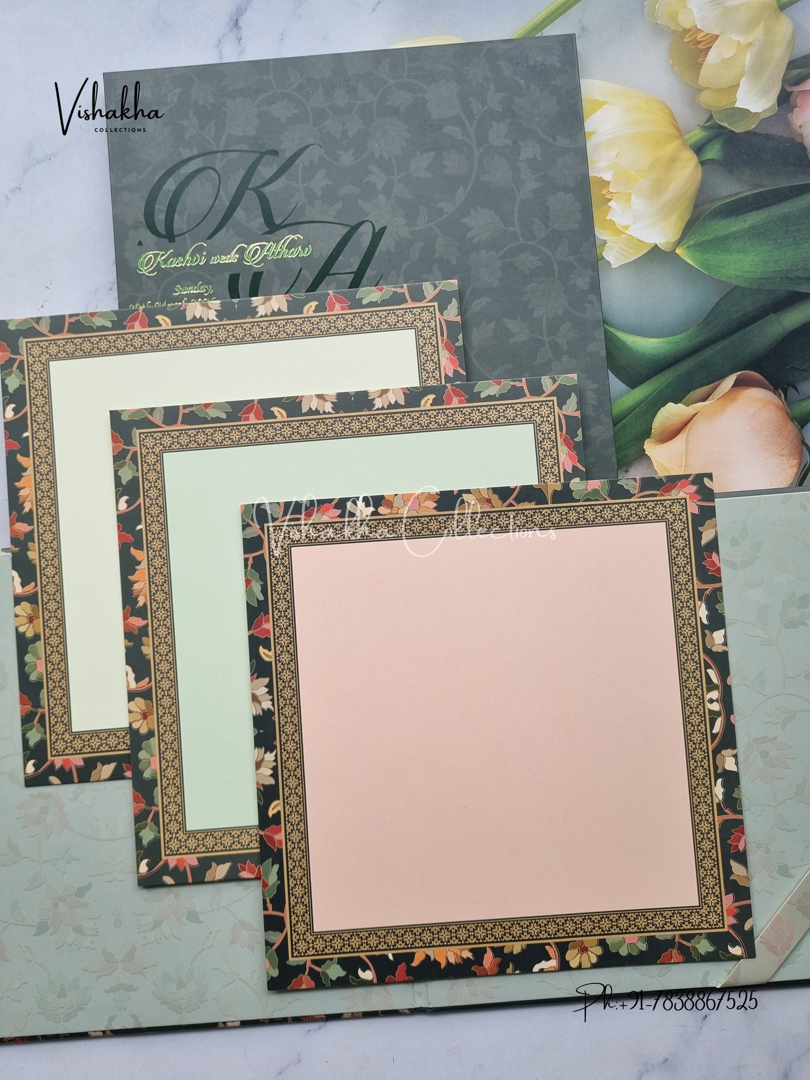 Vishakha Collections presents you beautiful luxury wedding invitation cards with all latest designs and the latest variety. Its just not a wedding invitation card but a beautiful feeling of love and relationship it carries for you. Beautifully printed and packed with a bundle of love. if you like it, dont think again, just go for it.If you are worrying about the quality of the product, send your doubts to us. We are here to help you. If you want in wholesale or bulk, dont forget to contact us.