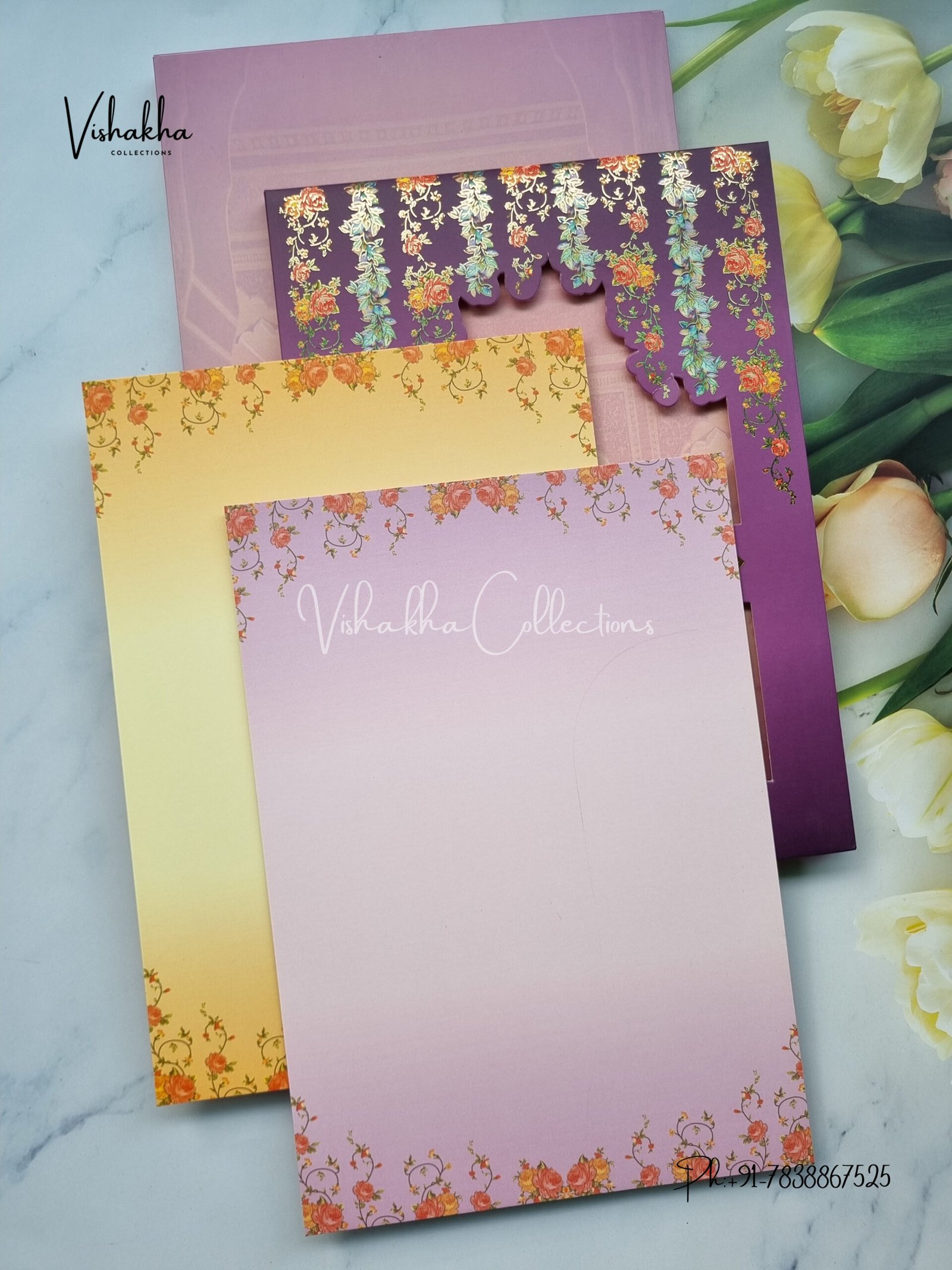 Vishakha Collections presents you beautiful luxury wedding invitation cards with all latest designs and the latest variety. Its just not a wedding invitation card but a beautiful feeling of love and relationship it carries for you. Beautifully printed and packed with a bundle of love. if you like it, dont think again, just go for it.If you are worrying about the quality of the product, send your doubts to us. We are here to help you. If you want in wholesale or bulk, dont forget to contact us.