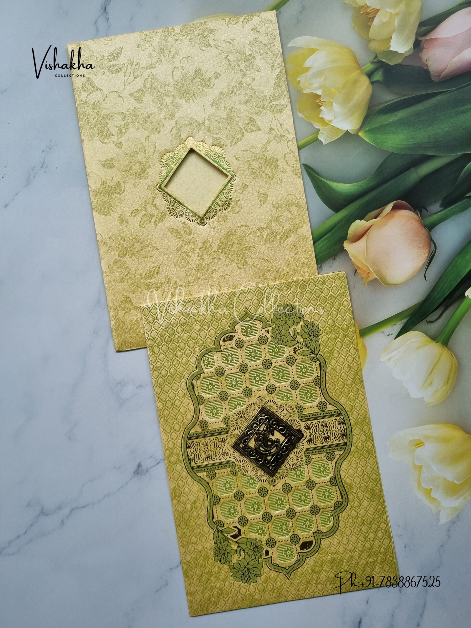 Vishakha Collections presents you beautiful luxury wedding invitation cards with all latest designs and the latest variety. Its just not a wedding invitation card but a beautiful feeling of love and relationship it carries for you. Beautifully printed and packed with a bundle of love. if you like it, dont think again, just go for it.If you are worrying about the quality of the product, send your doubts to us. We are here to help you. If you want in wholesale or bulk, dont forget to contact us.