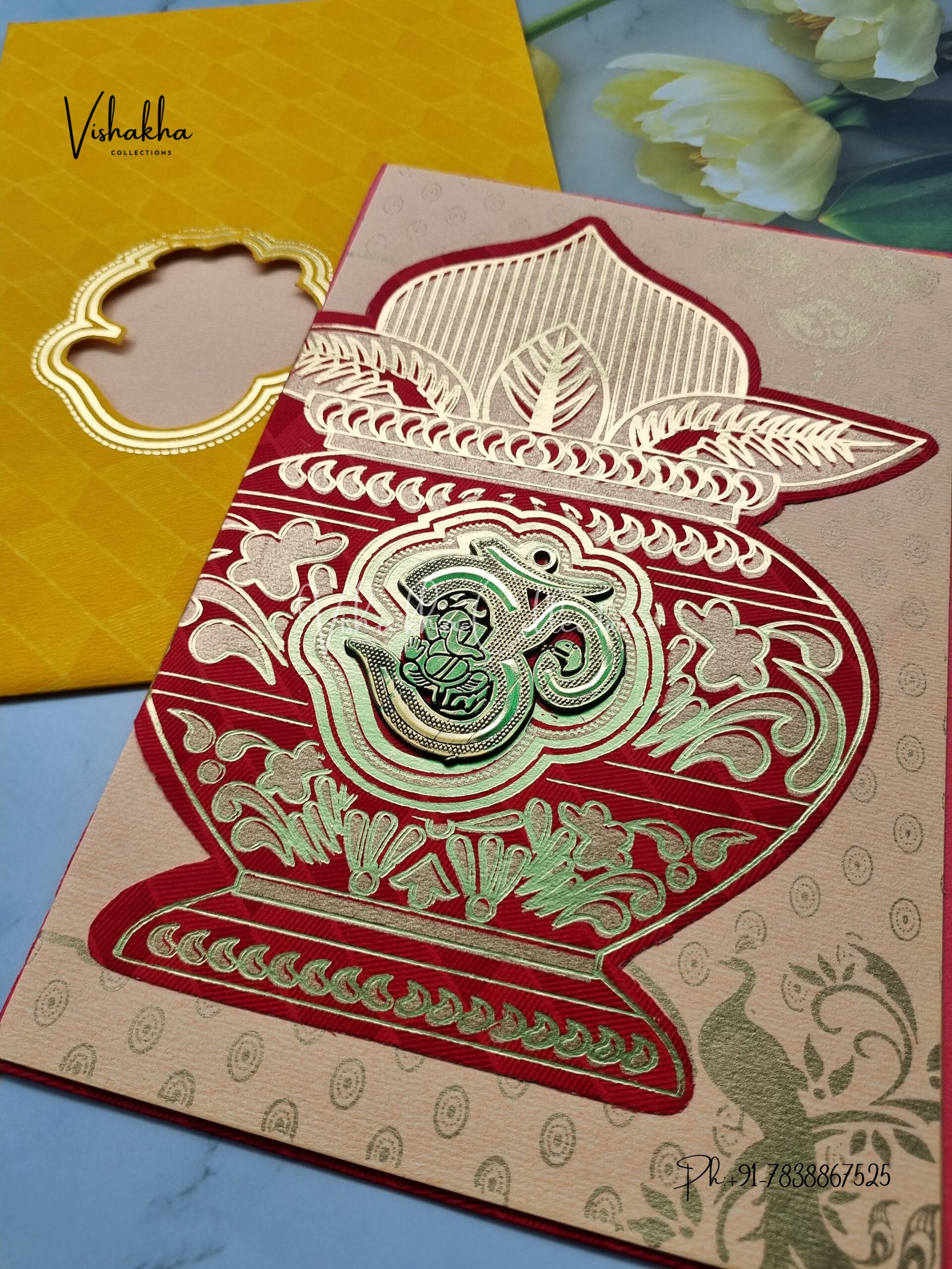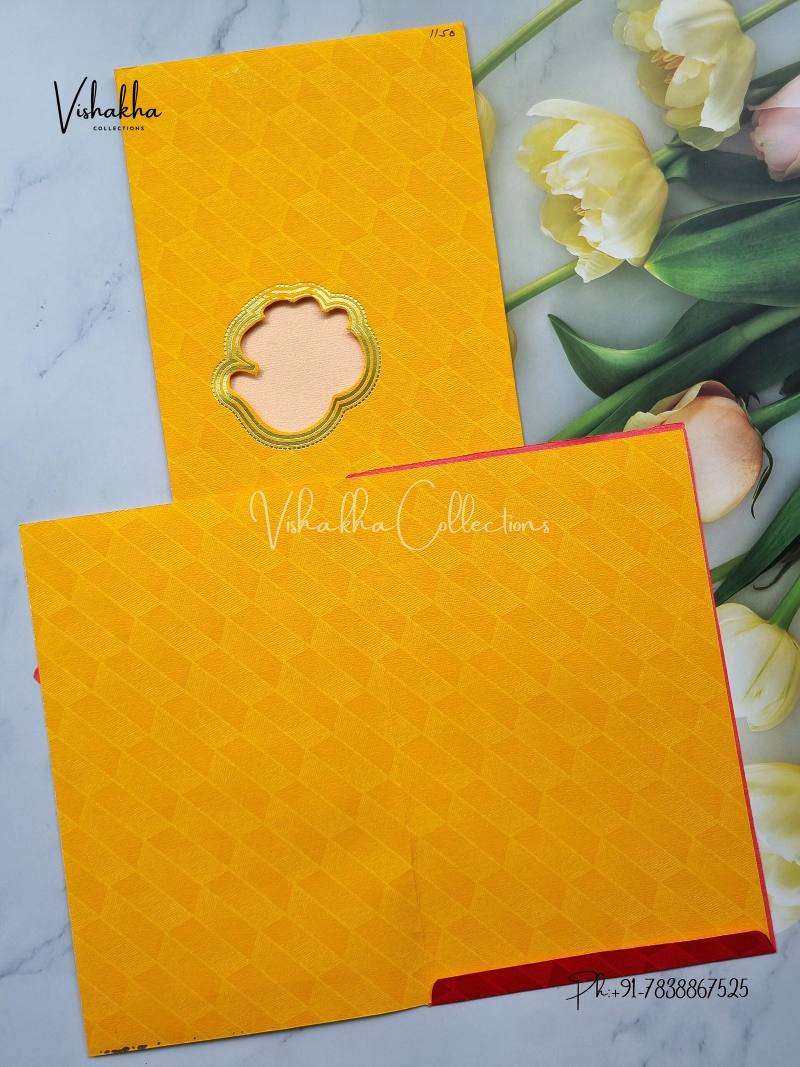 Vishakha Collections presents you beautiful luxury wedding invitation cards with all latest designs and the latest variety. Its just not a wedding invitation card but a beautiful feeling of love and relationship it carries for you. Beautifully printed and packed with a bundle of love. if you like it, dont think again, just go for it.If you are worrying about the quality of the product, send your doubts to us. We are here to help you. If you want in wholesale or bulk, dont forget to contact us.