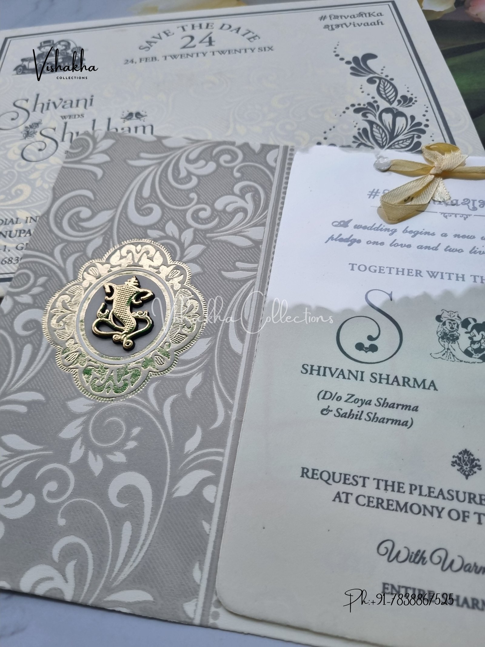 Vishakha Collections presents you beautiful luxury wedding invitation cards with all latest designs and the latest variety. Its just not a wedding invitation card but a beautiful feeling of love and relationship it carries for you. Beautifully printed and packed with a bundle of love. if you like it, dont think again, just go for it.If you are worrying about the quality of the product, send your doubts to us. We are here to help you. If you want in wholesale or bulk, dont forget to contact us.