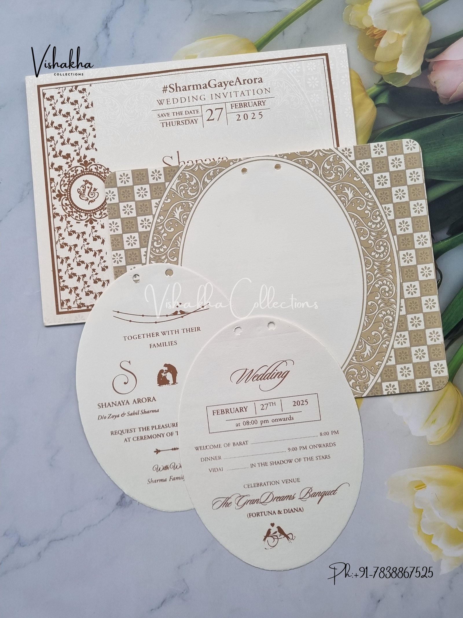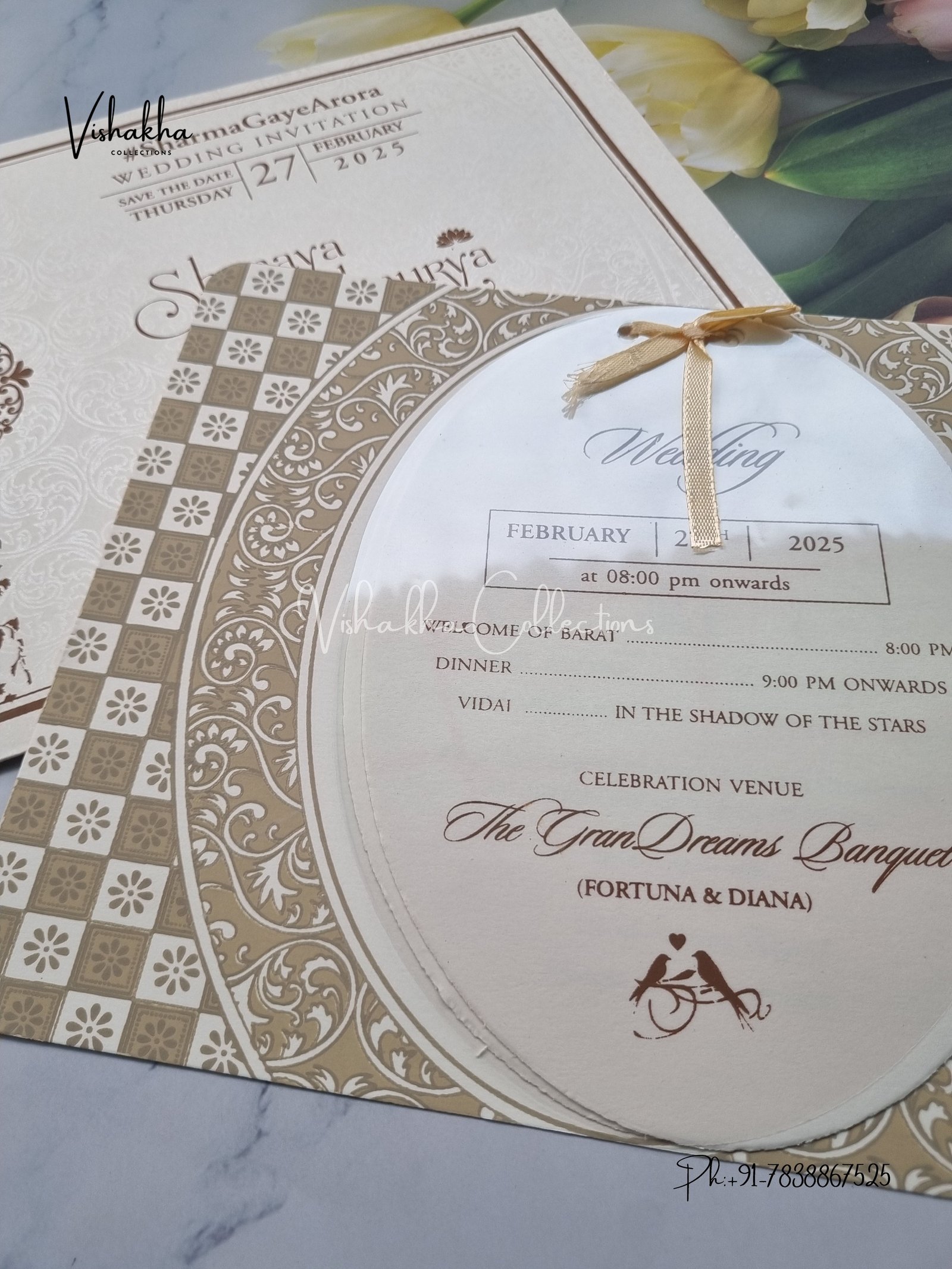 Vishakha Collections presents you beautiful luxury wedding invitation cards with all latest designs and the latest variety. Its just not a wedding invitation card but a beautiful feeling of love and relationship it carries for you. Beautifully printed and packed with a bundle of love. if you like it, dont think again, just go for it.If you are worrying about the quality of the product, send your doubts to us. We are here to help you. If you want in wholesale or bulk, dont forget to contact us.