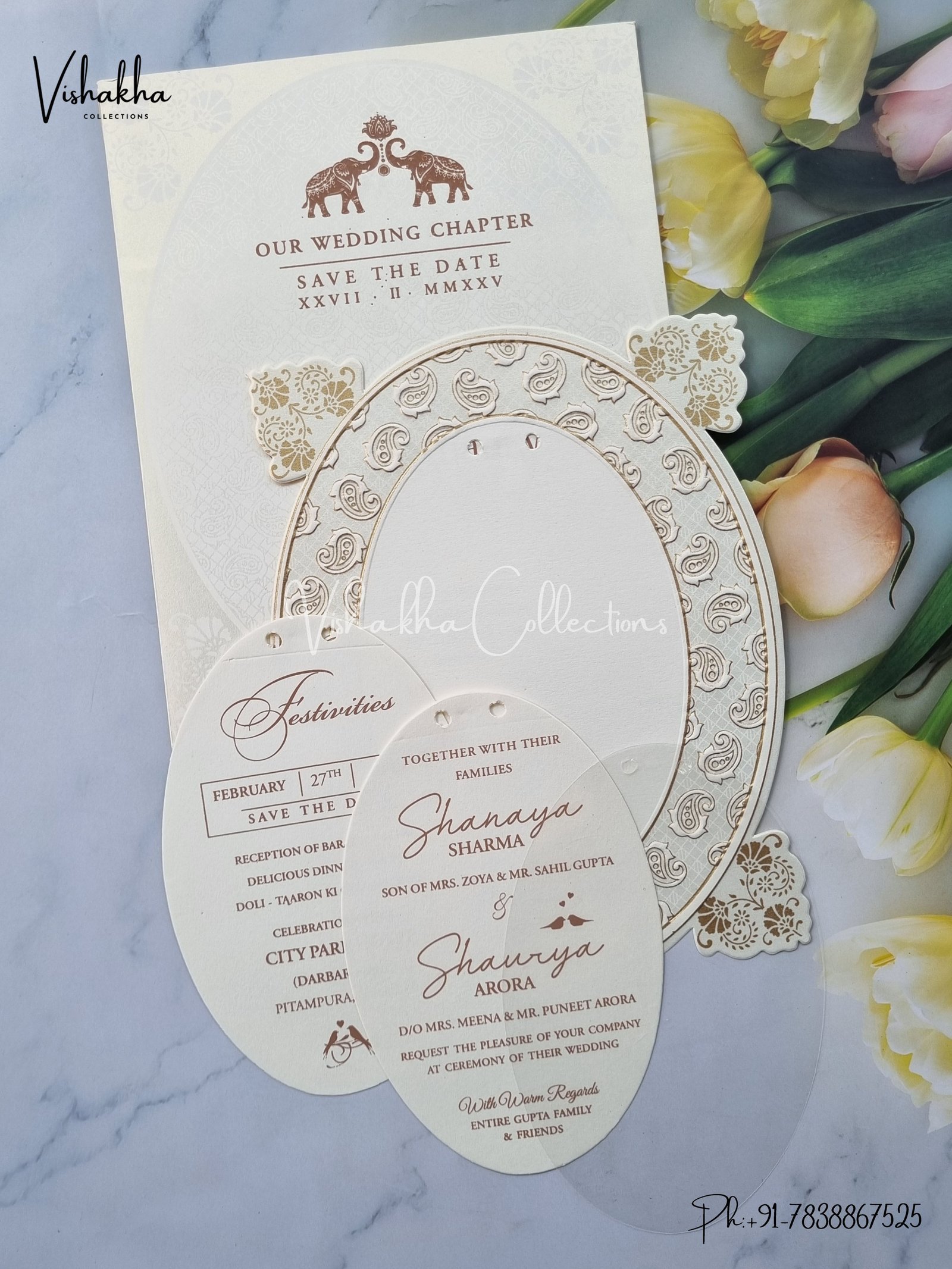 Vishakha Collections presents you beautiful luxury wedding invitation cards with all latest designs and the latest variety. Its just not a wedding invitation card but a beautiful feeling of love and relationship it carries for you. Beautifully printed and packed with a bundle of love. if you like it, dont think again, just go for it.If you are worrying about the quality of the product, send your doubts to us. We are here to help you. If you want in wholesale or bulk, dont forget to contact us.