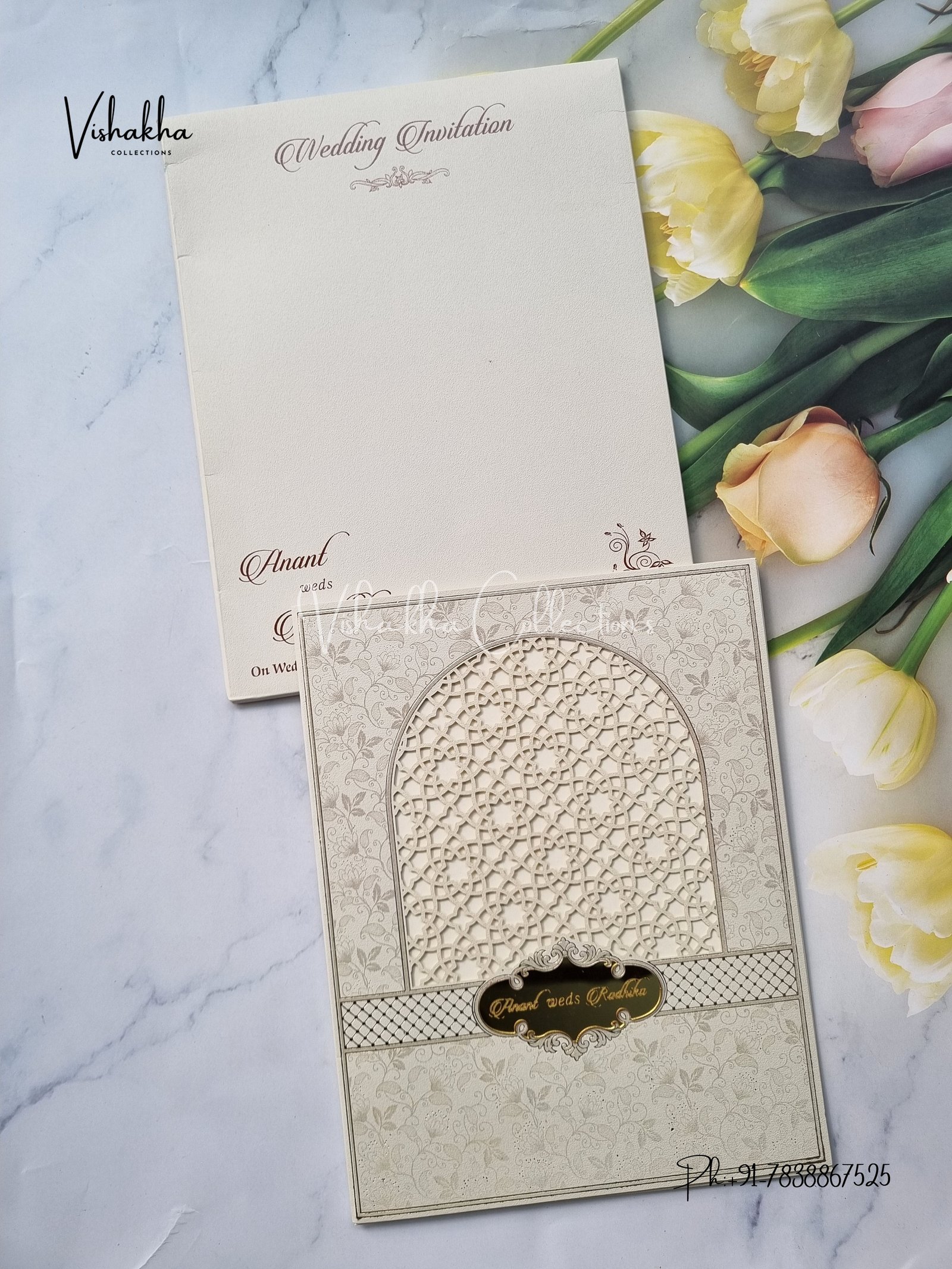 Vishakha Collections presents you beautiful luxury wedding invitation cards with all latest designs and the latest variety. Its just not a wedding invitation card but a beautiful feeling of love and relationship it carries for you. Beautifully printed and packed with a bundle of love. if you like it, dont think again, just go for it.If you are worrying about the quality of the product, send your doubts to us. We are here to help you. If you want in wholesale or bulk, dont forget to contact us.