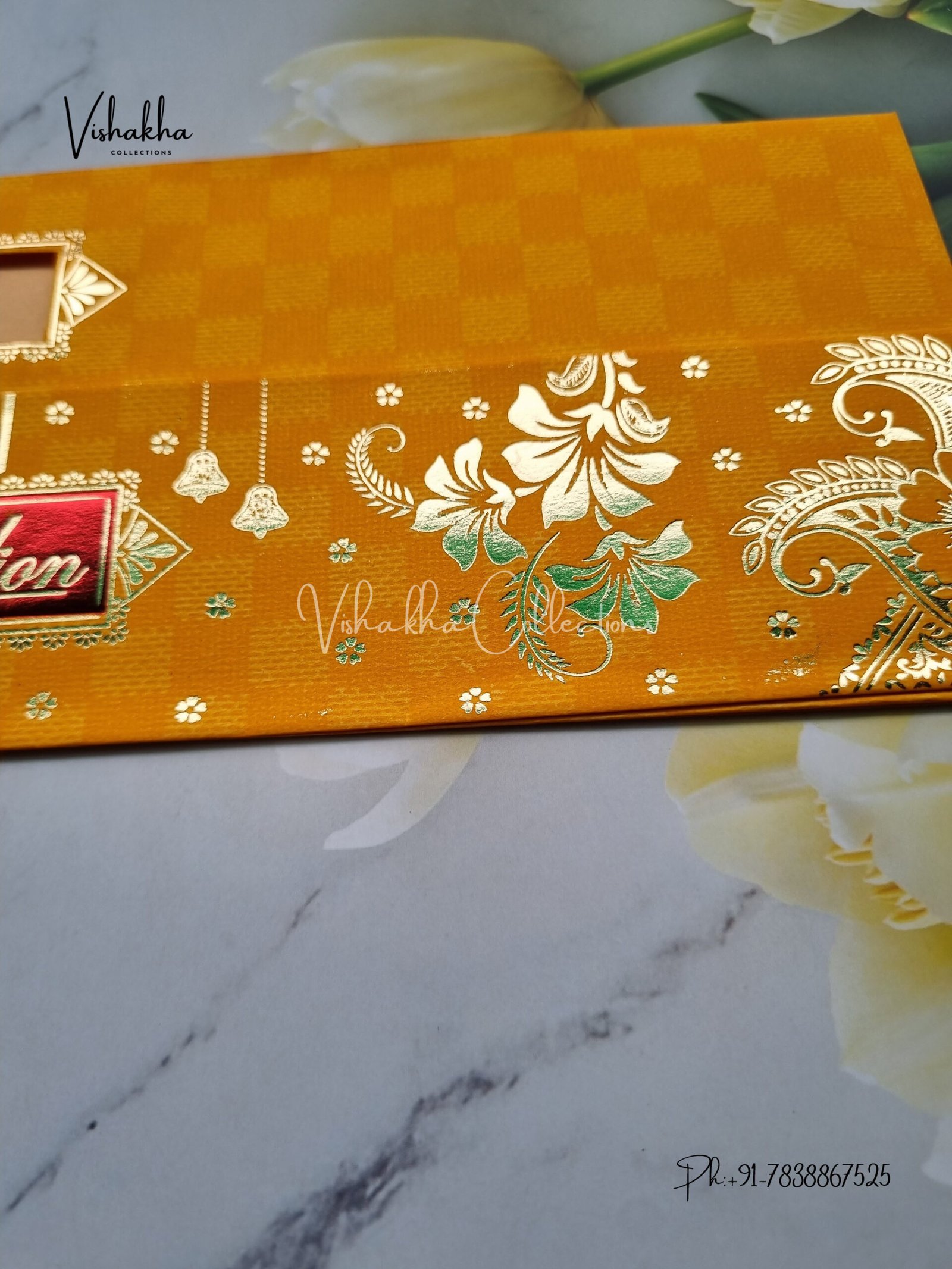Vishakha Collections presents you beautiful luxury wedding invitation cards with all latest designs and the latest variety. Its just not a wedding invitation card but a beautiful feeling of love and relationship it carries for you. Beautifully printed and packed with a bundle of love. if you like it, dont think again, just go for it.If you are worrying about the quality of the product, send your doubts to us. We are here to help you. If you want in wholesale or bulk, dont forget to contact us.